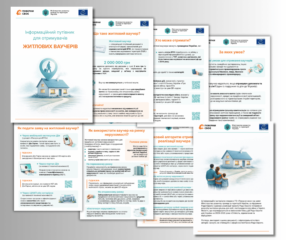 Розібратися в усіх деталях нової державної програми допоможе Інформаційний путівник для отримувачів житлових ваучерів. Цей роз’яснювальний матеріал було створено експертами «Поверни своє» на запит Міністерства розвитку громад та територій України за підтримки Ради Європи в рамках реалізації проєкту Ради Європи «Сприяння розробці житлових рішень для осіб, постраждалих від війни в Україні. Фаза ІІ», що впроваджується на виконання Плану дій Ради Європи для України на 2023-2026 роки «Стійкість, відновлення та відбудова».